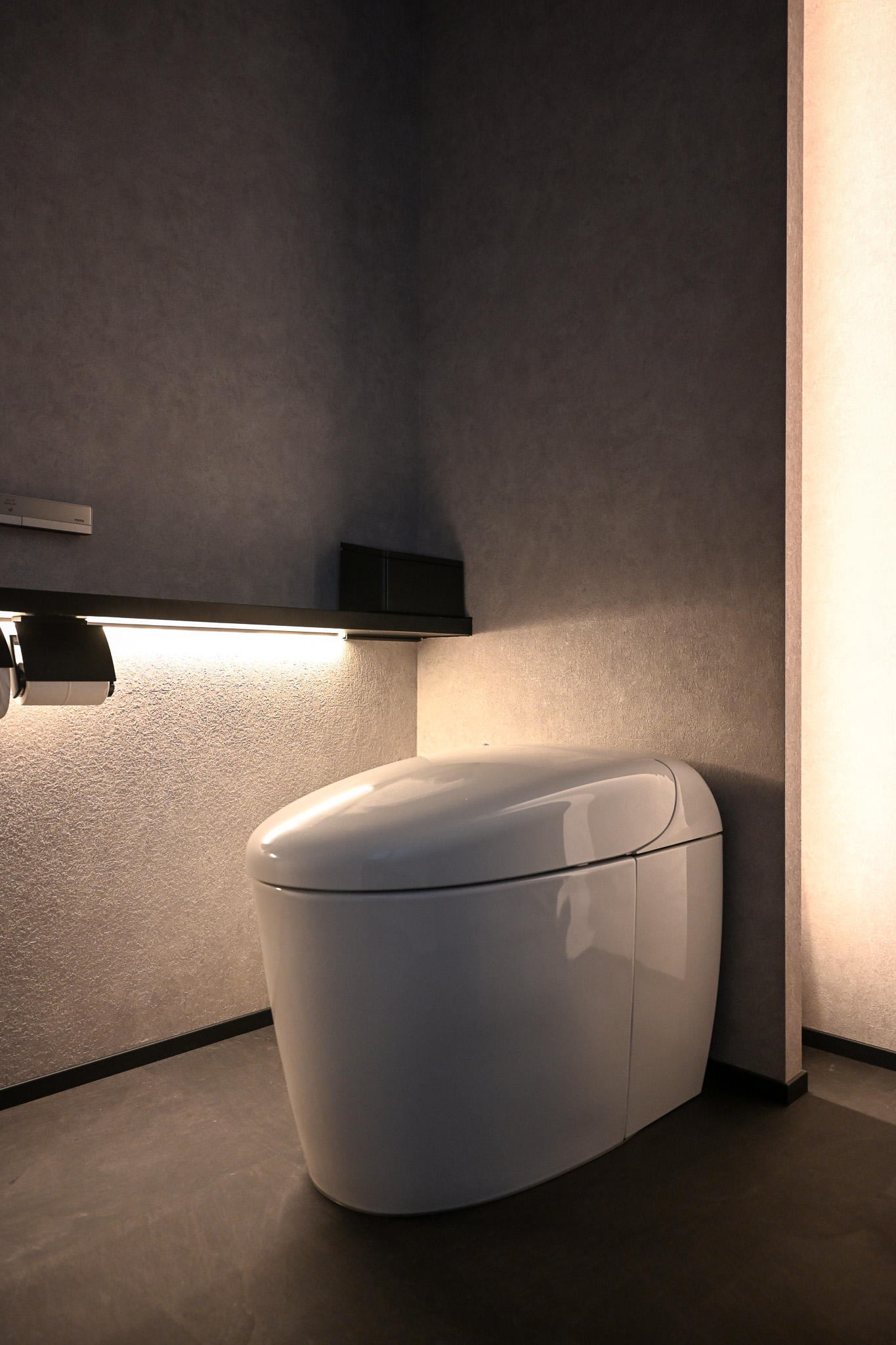壁裏と、カウンター下にコーニス照明を取り入れて、深夜に手洗いに入ってもまぶしくなく落ち着きのある手洗いに仕上がりました。